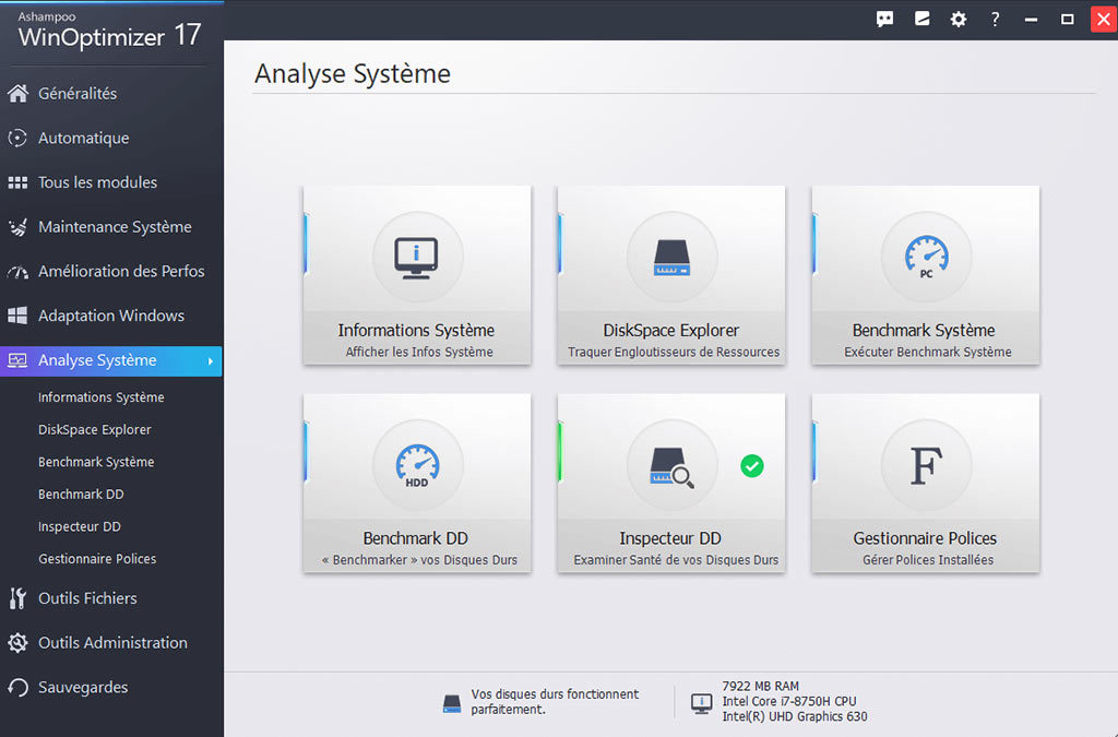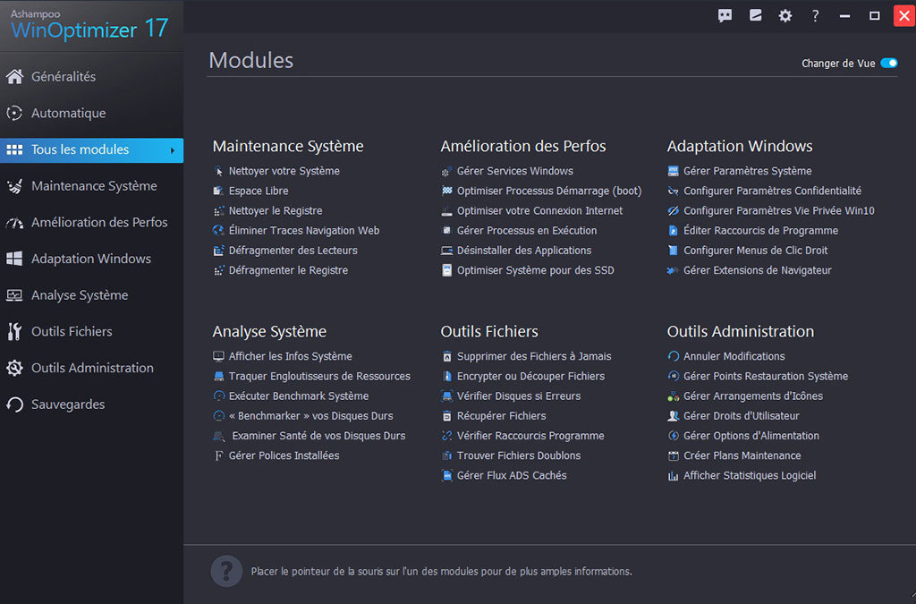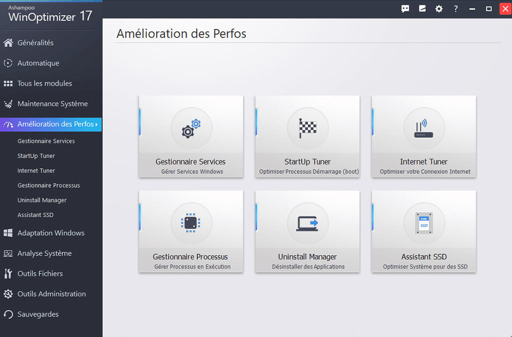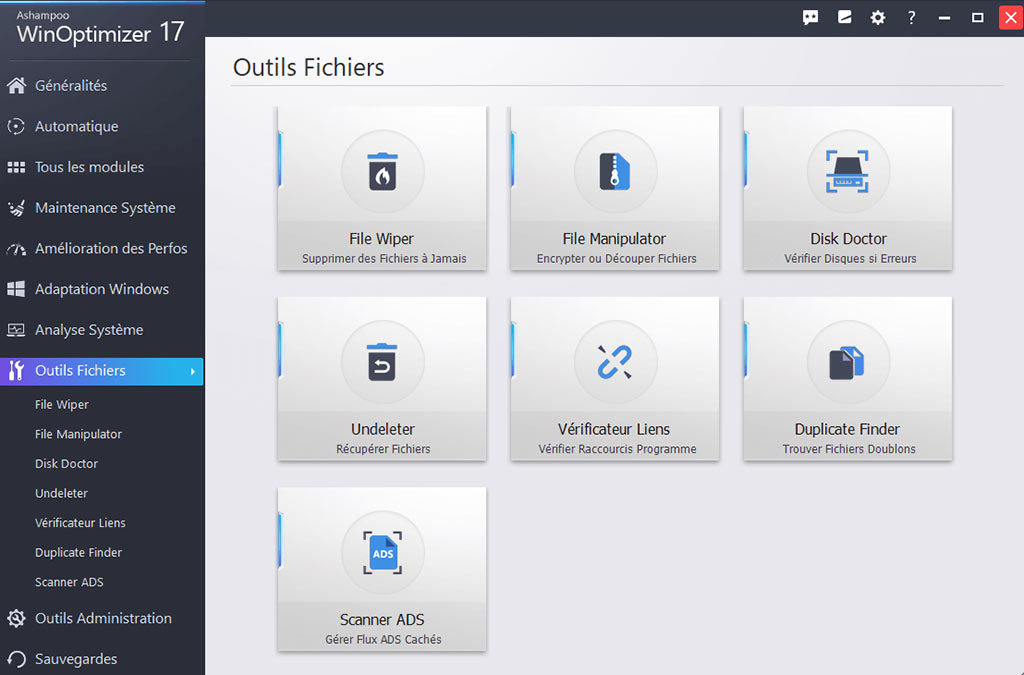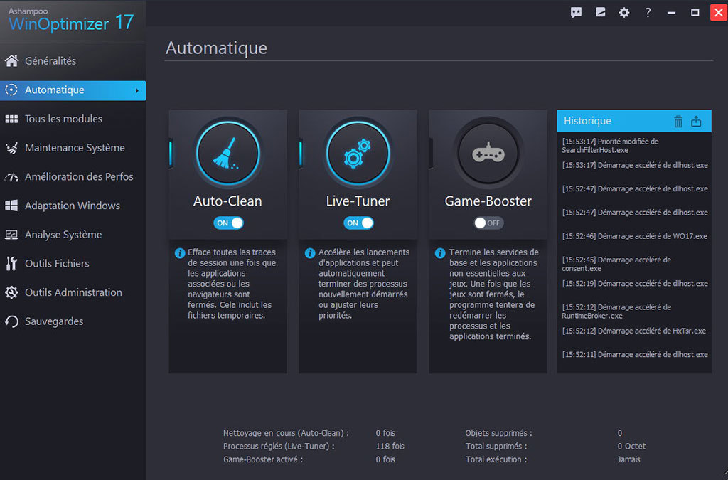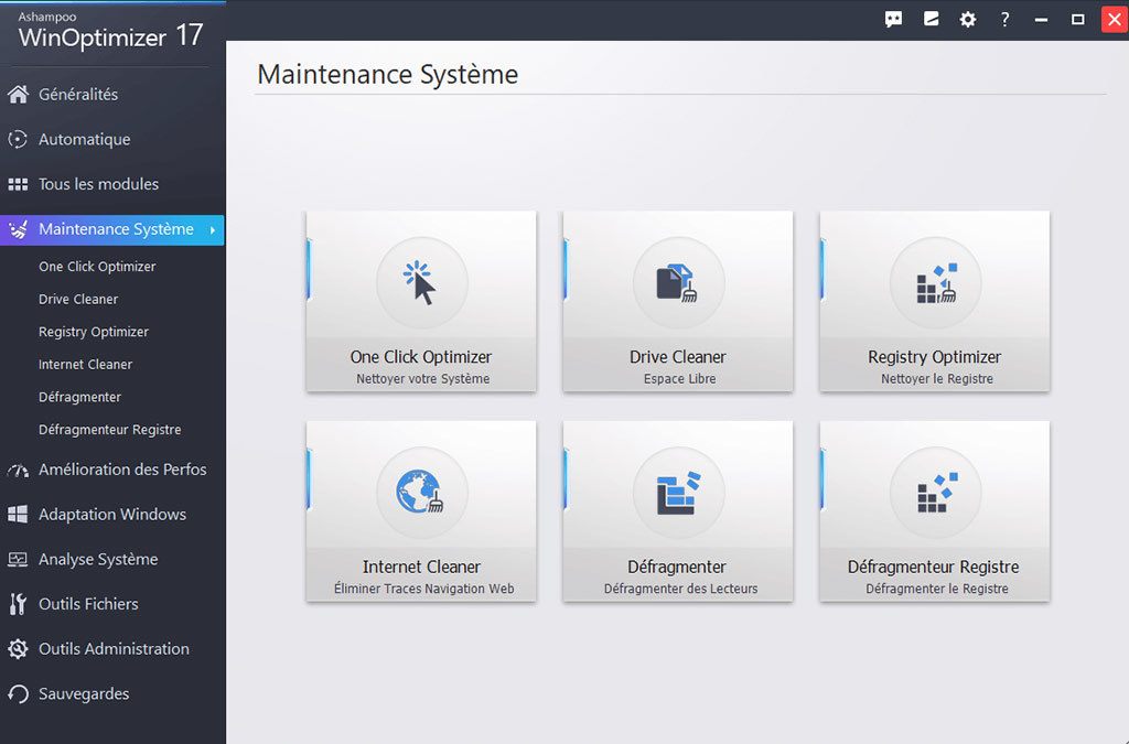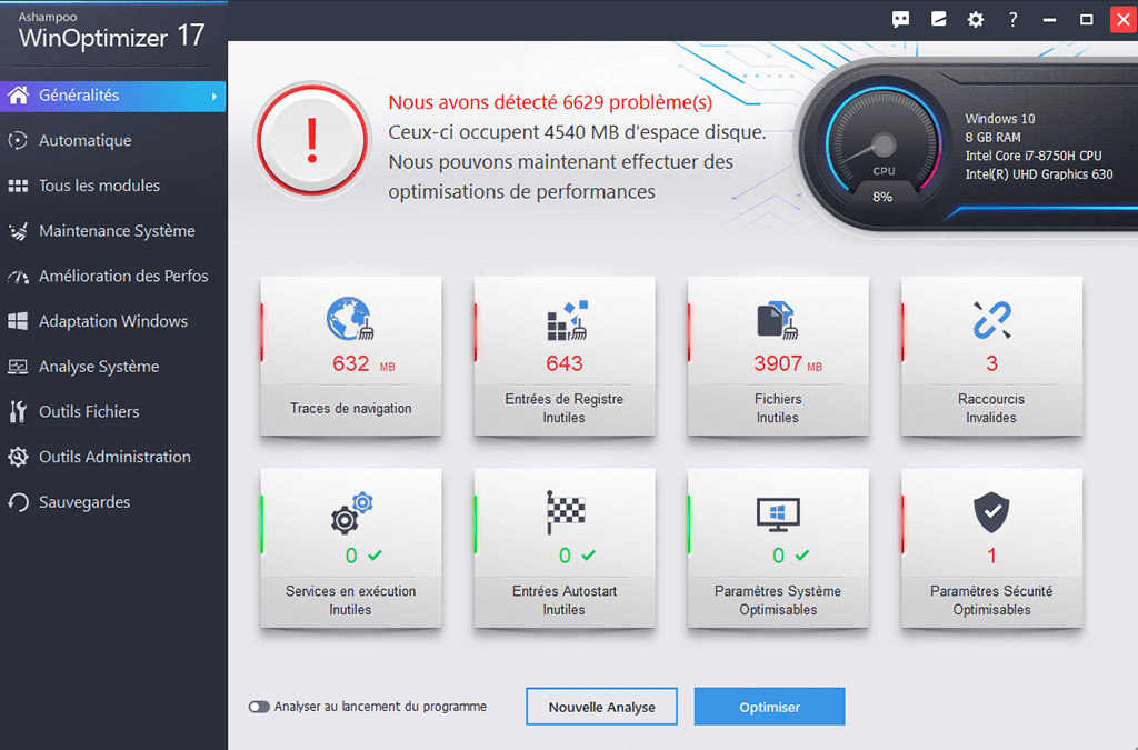 La page d'accueil seule offre de multiples façons d'optimiser, de régler et de nettoyer votre système d'exploitation en le débarrassant de fichiers inutiles. Les différents modules de nettoyage qui éliminent les traces de navigation sur le Web, les fichiers temporaires, les restes de désinstallation et les fichiers inutiles font partie de ses fonctions les plus populaires et aident à libérer et à récupérer des d'énormes quantités d’espace disque.