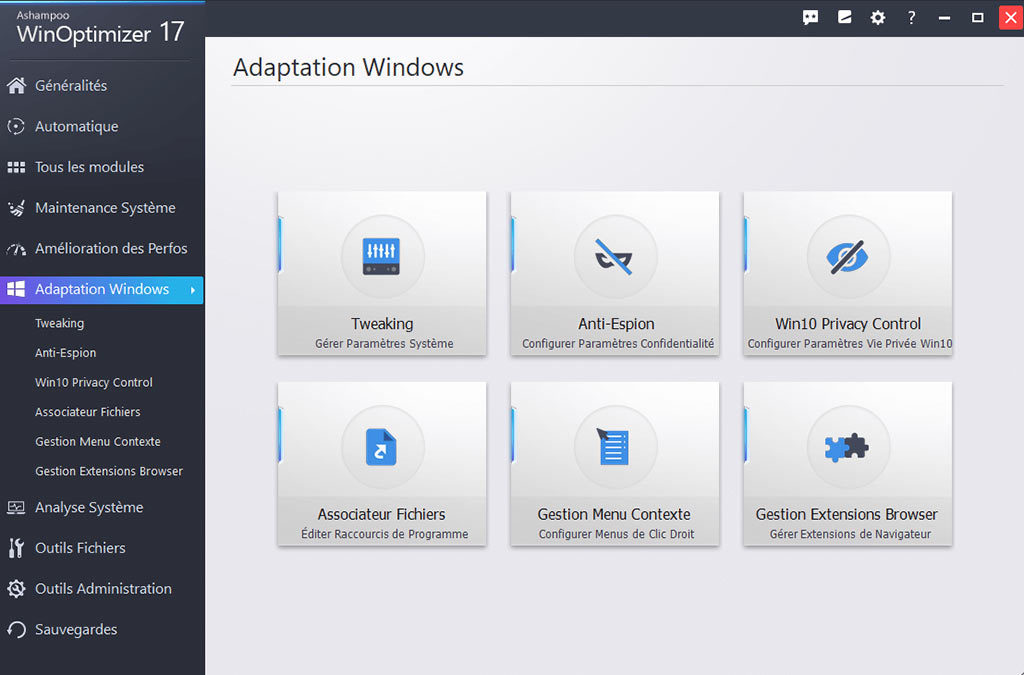 De plus, le Registre Windows est nettoyé, les entrées de démarrage automatique sont optimisées et les raccourcis invalides sont supprimés aux fins d’améliorer la stabilité et les performances globales du système. De multiples outils d'analyse du système fournissent un aperçu détaillé des composants matériels et logiciels installés et le module de peaufinage est mis à disposition doté de multiples options de personnalisation Windows Browser Extension Manager (Gestionnaire d'extensions de navigateur) gère les extensions de tous les navigateurs courants de tous les comptes utilisateurs et fournit un moyen rapide de désinstaller les extensions indésirables.