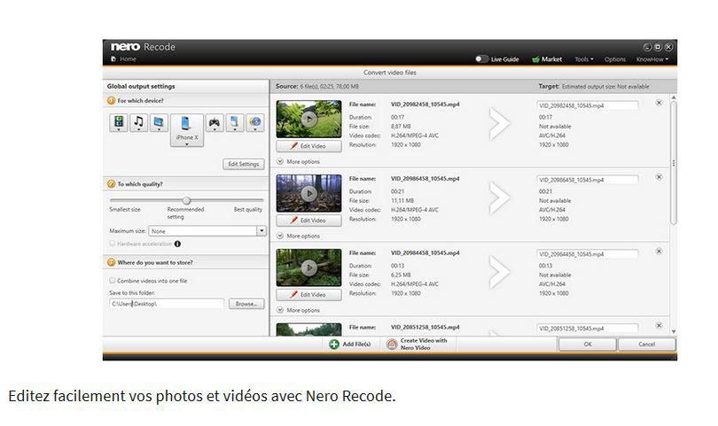 Vous voulez transférer et lire facilement vos fichiers vidéo et audio de votre PC vers votre tablette ou smartphone? Qu'il s'agisse d'appareils mobiles, PlayStation®, Xbox® ou lecteur MP3, Nero Recode trouve toujours le bon format grâce à la prise en charge des appareils les plus récents. Maintenant, vous pouvez également convertir vos fichiers vidéo spécifiquement pour l'utilisation dans les disques vidéo (DVD‐Video™, AVCHD, Blu‐ray Disc™). Lors de l'importation dans vos projets de vidéo et de disque vidéo, ils augmentent les performances et n'ont plus besoin de se convertir au format approprié pour la gravure. Créez facilement des listes de tâches pour vos conversions programmées et exécutez de gros travaux de conversion du jour au lendemain avec l'option Eteindre l'ordinateur une fois terminé. - Éditer