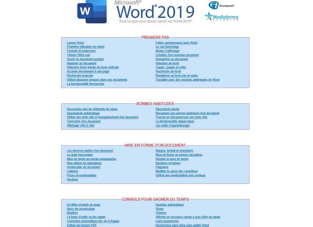 Formation à Word® 2019 vous permettra de maîtriser l’ensemble des fonctionnalités du nouveau Word® 2019 à l'aide d'une formation vidéo interactive aussi bien conçue pour les débutants que les utilisateurs confirmés.